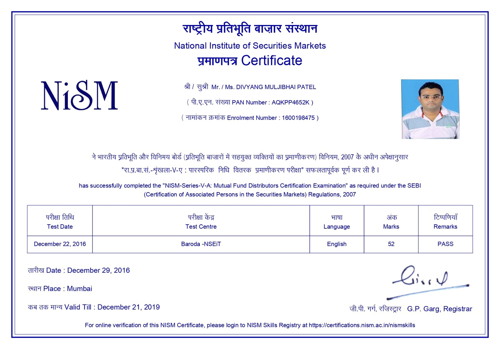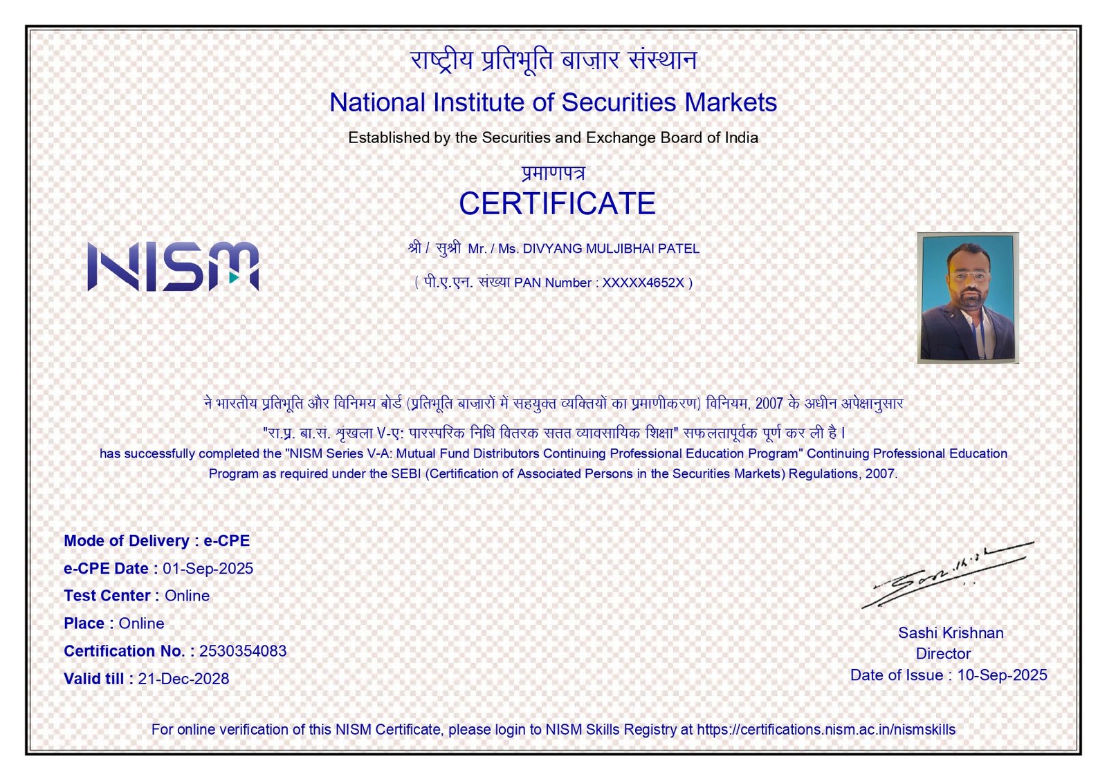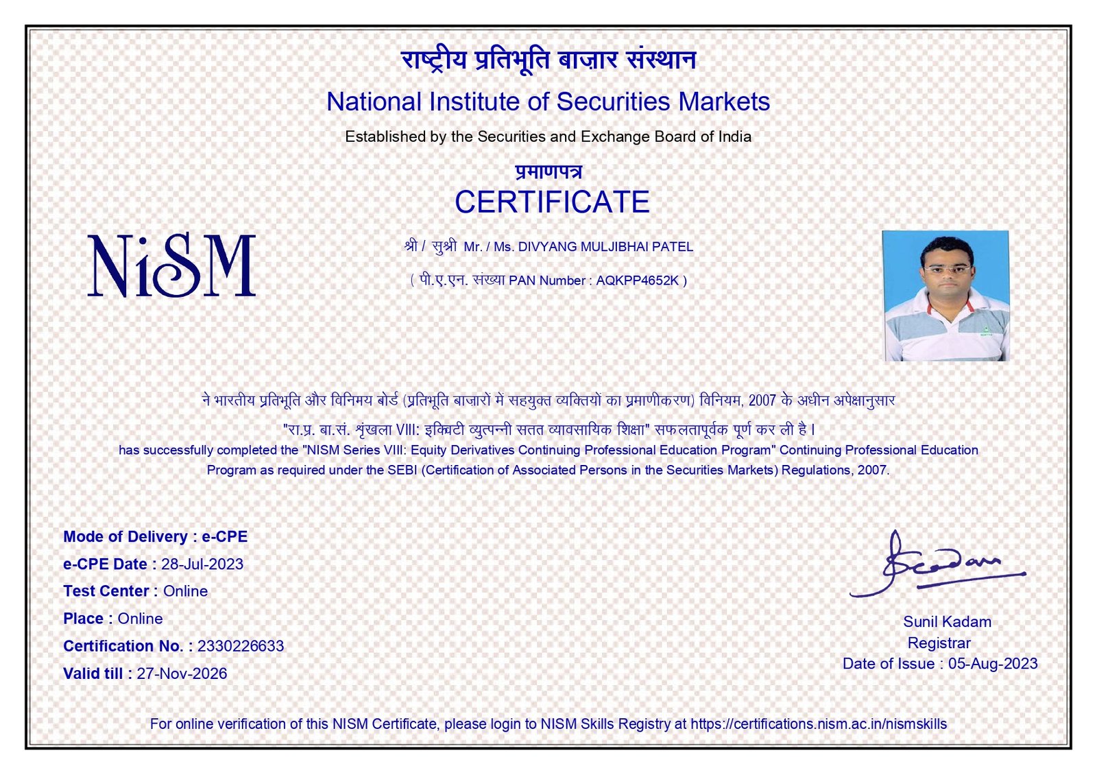 Our team is NISM Certified (National Institute of Securities Markets), an institution established by SEBI (Securities and Exchange Board of India) to promote best standards in the securities market. We have successfully completed the NISM Series VIII – Equity Derivatives Continuing Professional Education (CPE) Program, as mandated under SEBI regulations.